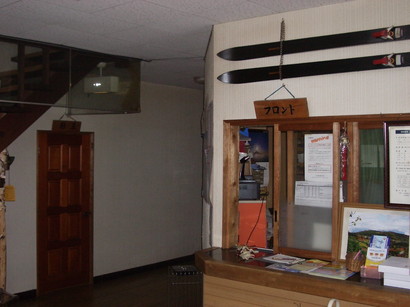 正面には階段(僅かに見えますね)があり、2階へと行くことができます。フロントの上にある古いスキーがいい味出してますねぇ〜。また、このフロントの木枠などもいい意味で年季が入っており、ぼら〜ちょの旅行気分を盛り上げてくれます。ちなみに