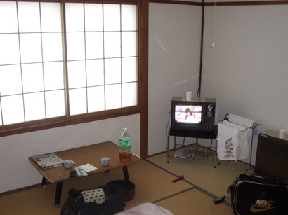 扉を開けると、そこには8畳一間の部屋がありました。部屋には折りたたみテーブルとテレビ、暖房とタオル掛けしかありません。入口には下駄箱があり(靴は各自で部屋まで持ってくるシステム)、その両サイドに押し入れがあります。とてもシンプルな部屋ですが、必要充分であります。朝から部屋に入ることが出来るなんてとてもラッキーであります!!が、この部屋でとても驚いたことが一つあります。それはテレビです。写真のテレビを見て下さい。昔ながらのダイヤル方式のチャンネルとなっています。これはぼら〜ちょが子どもの頃にお世話になったタイプであり、思わず「あー、これ懐かしいー!」と言ってしまった程です。